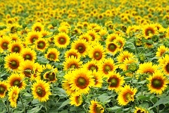 向日葵又称望日莲,她有着阳光一般热烈的色彩,硕大的圆形花盘明朗而又大方,坦然而又执着的追逐着太阳。那样的明艳,那样的光彩照人。几年来在安省GuanGuan和我曾经找到过几个种植向日葵的农场,每当看到那一片片金色的花朵如火焰般绽放在夏日的艳阳下,总觉得心中的每一个角落都洒满了阳光。可惜的是近两年来这些农场都纷纷改种 玉米了,难道种植向日葵的利润不如种老玉米?失望之余我们也曾经憧憬着去买个农场,第一年种向日葵,第二年种油菜花,第三年种薰衣草,岂不美哉?路边的这片向日葵长得太高了,GuanGuan试图爬上车顶去照相,结果发现这普通轿车的车顶太单薄了,只好站在椅背上从天窗里探出身去照,看上去挺滑稽的。GuanGuan一边拍照一边大发感慨,”还是和梵高一样讲法语的农民比较有文化呀!”