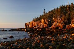 清晨4点准时被闹钟叫醒,这盛夏时节早上去拍日出真是太辛苦了。昨天在Visitor Center偶然见到的一张明信片让GuanGuan记住了Otter Cliff这个拍日出的好地方,于是害得我也睡不了懒觉。我睡眼迷恋的指挥着GuanGuan在晨曦微明 中超近道来到了Otter Cliff附近的停车场,结果在悬崖顶上晃悠了半天愣是没找到下山的路。眼见着天边的红晕已经越来越明艳,我们只好顺着公路往回走,紧赶慢赶终于在旭日东升之前找到了Otter Cliff边上的鹅卵石滩。海上日出并没有多少新奇可言,在这里最迷人的是那沐浴在晨光中变幻着色彩的巨石崖壁,由滟滟的橘红到明朗的金黄,比白天艳阳下的粗犷自是添了几许姿色。