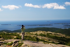 等天大亮之后看看表才5点多,于是毫不犹豫的开车回营地,钻回帐篷一觉睡到8点多。今天的计划是去爬山,原本是想从营地门口出发,走South Ridge一直爬到Cadillac Mt.顶峰。但是自从昨天发现那最高峰居然可以开车上去后,便对他少 了几分攀爬的兴趣,不如去附近的其他山头。不过趁着上午车少,还是先开车到山顶去看看风景吧。山路盘旋而上,沿途有许多的Lookout可以驻足远眺山下的秀丽风光,我们一路走走停停,为美景陶醉的同时也无比的钦佩那些骑车登顶的帅哥美女们。想当初乡间公路上的几个大坡就累得我精疲力尽了,这等盘山路真是想都不敢想。在山顶又转了一圈之后发觉东面Dorr Mt.的小山包看着挺亲切的,索性今天的徒步就从下山开始吧。