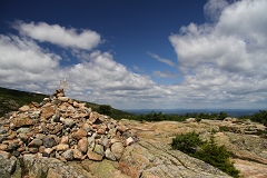 我们轻松的从山顶走下来,一路上都是裸露的岩石和低矮的灌木丛,一颗颗圆润饱满的蓝莓在阳光下闪现着诱人的光泽,我边走边摘边吃,毫不在意GuanGuan在一边颇为鄙夷的表情。直到走进海拔较低的树林中才总算暂时吧吃放在脑后。过了Gorge Trail的岔路就开始爬山了,好在Dorr Mt.没有那么高耸,刚有些气喘吁吁是就已经爬到山顶了。只可惜Dorr Mt.置身群山环抱之中,既看不 见大海也看不到港湾,只有Cadillac Mt.浑圆的山体象堵屏障一般横亘在蓝天白云之下。”征服”了Dorr Mt.之后我们研究了一下地图,决定走Dorr Mt. South Ridge下山,转Canon Brook Trail,再沿着Cadillac Mt. South Ridge爬回山顶。下山的一路上简直象进了蓝莓农场,我已经几乎顾不得抬眼看风景了,还是低头摘果子吃更开心。就这么一路走一路吃,GuanGuan嘲笑我的饭量都赶上黑熊了。Canon Brook Trail贯穿于两条山脊之间,一条小溪在路旁欢跃着,那清清亮亮的水漫过平缓的巨石,在炎炎夏日中怎能抗拒如此清凉的诱惑,于是趁着吃午饭的功夫又在水边玩了半天。Cadillac Mt. 的南坡是一条很热门的登山路,人来人往络绎不绝。沿途的蓝莓已经被摘得所剩无几了,很是令人失望。