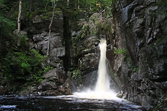 一路上浓荫蔽日,溪水相伴,野趣盎然。过了小巧秀气的Kinsman Falls后道路变得越来越崎岖,再加上昨夜的一场豪雨,简直泥泞得无处下脚。又往前走了一段路忽然发觉Trail的标记居然找不到了,GuanGuan和我这才意识到恐怕是走错路了。赶紧拿出地图来仔细研究一下,正看图时身后跟上来几个人,也是走得气喘吁吁的抱怨着路怎么这么差。我随口附和着,正想说”看把我的鞋都弄脏了”时,一眼瞥见旁边两位那四只好象刚从泥潭中拔出来的登山靴,于是赶紧把后半句咽回了肚里。认真看了看地图后我发现正经的小路应该在河对岸,也就是说我们错过了那个过河的地方。GuanGuan和我决定原路返回,另外两个人决定继续往前探险,他们指着自己的一双泥脚笑说”We have nothing to lose.”。GuanGuan和我很快就退回了河边,正赶上几个年轻人在互相搀扶着过河。再仔细一看,河对岸的大树上果然有个Trail的蓝标,只是太不醒目了。Rocky Glen Falls并无太多动人之处,在这里我们终于又碰上了刚才走错路的那一对,他们最后大无畏的涉水过河,倒是把脏鞋冲洗得干干净净了。