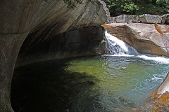今天的第一站是The Basin,一个位于Franconia Notch State Park中的一个非常大众化的免费景点。所谓Basin,其实就是冰川运动遗留下的一个巨大的壶穴(Pothole),只不过这个洞的确是够大的,直径有近20ft.。湍急的水流将一路上的岩石雕琢出细腻的纹理和曲线,最后化成一道小小的瀑布融入Basin的一池碧水之中。GuanGuan和我并没有急着去看那个大水池,而是沿着Basin Cascades Trail去探寻上游的两个小瀑布。