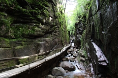 早晨吃过早饭就直接赶奔Flume Gorge。这个收费的景点每天9点才开放,而且游人众多。我们赶在景区一开门就进去,想趁人少的时候拍拍照。Flume Gorge是一段幽深狭长的峡谷,两边岩壁高耸,中间溪水层叠。一条木栈道依峭壁而建,Avalanche Falls从身旁的绝壁上飘然而落,扑面而来的水雾带来一丝丝清凉。这一段峡谷虽然不长,但水清石润,颇为清秀可人。除了幽谷飞瀑外,景区中还有两座小廊桥,红色的精巧别致,原木的朴素简约,周围山林溪谷相伴,极具幽静。