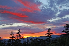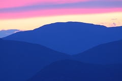 在山谷中一直呆到天色昏暗我们才离开,顺着The Kanc一路向西,走着走着漫天乌云忽然从西方透出些许温暖的红光。GuanGuan说今晚的日落一定很漂亮。开始我还不以为然,后来眼见着那红光越来越明亮,色彩越来越浓艳才不得不佩服GuanGuan的预测。可是山路崎岖狭窄,两边又是密林高耸,根本没有办法停车拍照。好在这条路昨天走过一遍,我依稀记得沿途有个朝西的Lookout,于是指挥着GuanGuan一路狂奔,总算是在日落之前,在彩霞满天之时赶到了Hancock Lookout。GuanGuan停了车,来不及熄火就抓起相机和脚架冲了出去。此时窗外已是彤云漫天,原本层层叠叠的乌云在夕阳的渲染下变幻出耀眼的橘红与橙黄,远山近树在艳丽的天际中变成一幅幅线条柔美的剪影。深沉的黑与绚丽的红之间笼罩这一抹清冷的蓝调,随着暮色在逐渐的加深,直到红霞褪尽,暮霭苍茫。