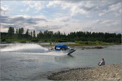 傍晚的Talkeetna小镇热闹非常,大街上,餐馆外满是游人。看看天空已逐渐放晴,我们决定按原计划明天去坐小飞机看冰川,也就是Flightseeing Tour。这是我们此行唯一没有提前预订的项目,一来是Tour Saver上安排的时间不合适,二来我担心天气不好飞行的效果会大打折扣,因此决定到了以后视情况而定。我们先去了Talkeetna Aero Services,结果时间和价格都不合适,随后来到Talkeetna Air Taxi,早上8点半一班居然还有空位,赶紧订了下来。随后去找营地,拿着Lonely Planet按图索骥的来到了Talkeetna Boat Launch & Campgrounds,在一片小树林中安营扎寨。一切收拾停当已经是晚上十点多了,此时天空依然明亮,太阳依然离地平线很远,这哪里有一点夜晚的样子。因为时差的关系,现在已经是多伦多的午夜2点了,而飞越了万水千山的我们竟然还毫无倦意。我们住的地方顾名思义是个码头,此时大小船只纷纷返航,正好溜达到河边去看看热闹。原来乘船的多半是去参加Fishing Tour,主要是钓三文鱼,基本上人人都是满载而归。船家在河边就把鱼现场处理,只留下鱼身的两片净肉,剩下的头尾和鱼骨都便宜了围观的海鸥。看人家拿着一袋袋鲜红的鱼肉心满意足的离开,想来这垂钓的过程也一定很有趣吧。夕阳在温婉的Talkeetna River上洒下点点金光,Alaska的魅力就这样伴随着午夜的阳光悄然展示在我们的面前。