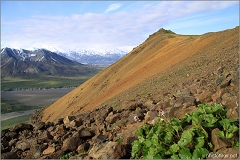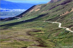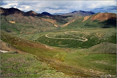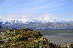 在去往Eielson的途中我们终于见到了两只Moose,不过对于来自Ontario的我们并没有多少新奇。中途还上来两对在野外露营的年轻夫妇,居然背着两个还不满周岁的孩子。到了Eielson才知道,原来他们是一路骑自行车进的公园,这可真是不到Alaska不知什么是牛人。昨天刚认识的几个来自Boston的朋友也同我们一起来到Eielson,他们计划先去山下转转,GuanGuan和我想趁体力好先去爬山。于是我们互道珍重后就开始向Thoro Pass进发。上山的路是修葺好的之字形山道,虽然一路走得气喘吁吁,但看着那红褐色的山脊离得越来越近,Visitor Center在脚下变得越来越小,一股豪迈之情伴随着那愈加壮丽的景色从心底油然而生。Thoro Pass是通向Mt. Thoro的一段山脊,隔着宽阔的Thorofare河谷与Mt. McKinley遥遥相对。由于山体遍布红褐色的砂石,使得它在周围一片灰绿相间的苍茫群山中份外的醒目。Hiking的魅力之一,是每次站在山顶极目远眺,让那一路辛劳消融在眼前的旖旎风光之中。那天早晨的Thoro Pass属于GuanGuan和我,在这里我们又一次为Denali那特有的恢弘壮美所打动。黄绿相 间的山坡在脚下延伸,一直汇入远方那看不到边际的群山之中,宽阔的河谷中看不见奔流的河水,经过流水冲刷后的灰褐色大地透着一片荒芜,更衬得周围碧绿的苔原一片生机勃勃。Mt. Eielson从对面的山谷中拔地而起,虽然没有冰雪压顶的巍峨,却自有端庄肃穆的王者风范。说不尽天之高远,地之辽阔,山之伟岸,连天上的云都变得那么气势磅礴。Denali的美,粗犷豪放,是一种坐拥天地的豪情万丈。与它的原始与自然相比,大峡谷可以称之为秀美,落基山可以称之为精致。