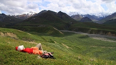 下山我们选了书中指出的捷径。在通往Little Stony Creek的路上,远远的看见山下有个人影,因为昨天Nancy在这附近下的车,而今一看到那孤身一人的身影我立刻就想到了她。因为离得太远看不清楚,我们加快脚边下山。也许是我俩的黄色外套太过醒目,还没等我们认出她来,Nancy已经兴奋的招呼着我们,昨天同车的来自加拿大的朋友。这旷野之中的重逢真是太意外太高兴了。我们兴高采烈的交流着这一天来的奇遇,我们昨晚看到的Mt. McKinley,今天早上爬的Thoro Pass,还有她在清晨看见的40多只驯鹿和几头棕熊,听得GuanGuan和我目瞪口呆。随后我们拍了合影还互留了E-Mail地址,她看到Photohiker后便问我们是不是常去TripAdvisor,因为她是那里的常客,网名DenaliCat。天哪!这名字真是如雷贯耳,原来她就是论坛上赫赫有名的景点专家,想当初从她的回帖中学了不少东西呢。Nancy对大自然由衷的热爱,对Denali的痴迷深深的令我们感动。象她那样把自己融入这广阔天地间,尽情享受那原始自然之美又何尝不是我心中最深切的向往。