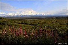 晚饭后我们又去湖边转了一圈,管营地的老太太说湖中有一对Loon正在孵蛋,我们用望远镜找了半天才远远的看见那对水鸟的影子。傍晚时下了点雨,天空云雨交叠,变幻多端的云朵一会儿象个螃蟹钳子,一会儿象个狗熊爪子,妆点得Mt. McKinley也多了几分俏皮。晚上8点,看看天空渐渐放晴了,我提议去著名的Reflection Pond看落日。GuanGuan欣然同意,于是我们全副武装后带着所有的装备出发了。从营地到Reflection Pond单程大约1.5Mile,沿着公路一路上坡,这看似短短的两公里远比想像的要艰苦的多。GuanGuan和我足足晃悠了近一个小时才到。好在一路上风景优美,雪山草地在夕阳下显得愈发柔美。路边有许多尚未盛开的Fireweed,柔柔的粉色被夕阳镶了一圈金色的花边,在空荡荒凉的旷野中有种遗世独立的美,一如空谷中的幽兰。过了被大家称为”Y”的岔路口,GuanGuan和我开始在路边四下查看,生怕错过那个小水塘。我们不知道他的确切位置,书上也只有个示意图。就在我觉得走得腿都快要抽筋儿的时候,左手边的路旁赫然闪出一片波澜不惊的水面,映着天色的蓝色湖水平静的象一面镜子,夕阳照耀下的雪山象一幅画卷展现在眼前,那一刻的我们,忘了脚下的疲惫,忘了身边肆虐的蚊虫,没有神山倒影的Reflection Pond竟也是如此的惊艳。
