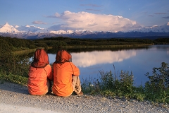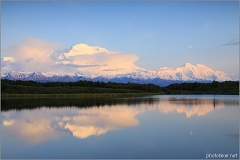 Reflection Pond是个不大的Kettle Lake。远古时期冰川消退时留下的残冰融化后形成了苔原上这些大大小小的水塘,其中最大的就是Wonder Lake,而最上镜的非Reflection Pond莫属。在我的印象中这里应该是个摄影大师们云集的地方,而今晚这仙境一般的地方只属于GuanGuan和我。落日夕照,伫立天边的Alaska Range静静的沐浴在金色阳光下,五彩轻云环绕其间,为那倒映水中的雄伟身姿平添了几许婀娜。而Mt. McKinley则羞涩的躲在云中不肯出来照照镜子。GuanGuan和我既来之则安之,好不容易艰苦跋涉了一个小时才到这里,怎么也得等到太阳落山才甘心。这一等就是两个多小时,寂静的湖畔除了执着的我们,还有成群的蚊子相伴左右。被夕阳镀着金边的云朵在缓缓的移动着,渐渐的所有的云雾竟然都聚集到Mt. McKinley的面前,将那庞然之躯遮挡得一丝不露。当Alaska Range的座座雪峰都眉清目楚的倒映水中,Mt. McKinley依然矜持的用云纱遮面,象个美丽而又高傲的公主在故意刁难这她的崇拜者们。夕阳如锦,雪山似玉,平湖如镜,这一幅山水彩绘已足以让见到它的人为之倾倒,能不能看到那座名山已经不那么重要了。GuanGuan在湖边守着他的脚架和相机,时不时的换个角度拍上一张。我坐在旁边摆弄着我的G9,偶尔与GuanGuan闲谈两句,而大部分时间则是对着那神秘的雪山出神。不知过了多久,月亮悄悄的从山后升了起来,雪山上的这一弯新月不知为那水天相映中的幽蓝平添了多少空灵隽秀。而Mt. McKinley也竟然不知不觉的从云层中探出头 来,夕阳点染过的面颊带着一抹绯红,仿佛面如桃花的娇羞少女。那原本将山体团团笼罩的云雾没有飘去任何地方,而是在原地奇迹般的消散了。午夜的阳光用她那特有的金色光芒将荒凉黯淡的山野化作温馨的伊甸园,Mt. McKinley身披薄纱般的彩云在连绵的雪峰簇拥下亭亭玉立在水天相接处,多么希望时光能够停止在这一刻,多么希望那变幻的色彩永不消退。不知何时,GuanGuan轻轻的握住我的手,我轻轻的倚在他的肩头,所谓浪漫,所谓幸福,所谓永恒,在这一刻,我们拥有。
