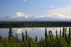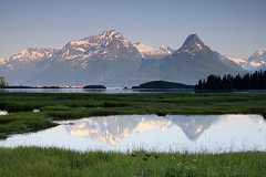 开车回城的路上,路边有一片郁郁葱葱的湿地,绿油油的草地中碧水如镜,此时天空渐渐的放晴,阳光照耀下熠熠生辉的雪山静静的倒映在水中,美得简洁自然,透着闹中取静的淡泊与宁静。GuanGuan和我一下就被那看似平淡无奇的景色吸引住了,无论是多么伟岸高耸的山峰,即便是如Mt. McKinley那般的气宇轩昂,当她的身影倒映在清宁的水中时,那说不尽的雄健威武中也会流露出一份难以言喻的灵秀,就如同驰骋疆场的英雄也会有儿女情长之时。山水有情,一如人间有爱。