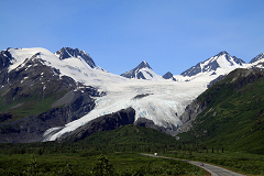 早上睡到日上三竿,从容的收拾好行装后去结帐,顺便在餐馆吃了顿丰盛的阳光早餐。今天我们要沿Richardson Highway一路向南,目的地是港口小镇Valdez。9点钟上路,公路两旁森林茂密,偶尔透过树林的间隙能看得蜿蜒在山谷中的输油管。在到达Glennallen之前我们好象一直在山林中穿行,偶尔能看到朝阳下朦胧的雪山伫立天边。过了与Glenn Highway交界的Glennallen之后,两旁浓密的森林渐渐的隐退,取而代之的是拔地而起的山峰。从山脚下墨绿的松林,到半山坡碧绿的草甸和灰褐色的裸岩,再到山顶白色晶莹的冰雪,四季之景,群山之色就这样一览无余的展现在面前。这一路上有无数的Turnout,景色各不相同,这要是每一处都停下来看看,估计天黑也到不了Valdez。此时那本砖头一样的Milepost就成了最好的行车指南。那上面记录了Alaska几乎所有公路的沿途信息,详尽到对每一个Turnout都有详细的描述,有些还配着照片。如今我的任务就是抱着“红宝书”边走边看,指挥着GuanGuan只在风景好的地方停车。其中的Mt. Drum from Willow Lake viewpoint,路边的一大片粉紫色盛开的Fireweed为那片秀美的湖光山影添色不少,那一簇簇华丽的粉红在一片清爽的蓝白绿中象火一般的热烈。一路走来,Alaska用她那浑然天成的山山水水诉说着一种无言的壮美。所谓天然之美,来自于那一座座雪山,一道道溪流,甚至是路边的一朵朵野花。