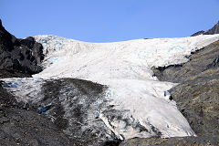 冰川的脚下是个小小的公园,可以沿着一条土路一直走到那冰舌旁边。GuanGuan和我岂能放过这与冰川亲密接触的大好时机,换上登山鞋就兴高采烈的上了山。冰川下面清凉的山风带着丝丝寒意,阳光下的层层坚冰也泛着清幽的蓝光,站在旁边真是寒气袭人。融化的冰水夹杂着碎石汇成一条条混浊的小溪奔流而下,GuanGuan和我在厚厚的冰块旁边照完像,准备跨过那几道脏兮兮的水流继续往上爬。就在我跨过水流踏上那布满碎石的地面时,忽然间感觉一脚踏空,原来那看似坚实的土地竟然是如奶昔一般的粘稠松软。我就这样一脚陷入了泥潭,身子一斜,另一只脚也不由自主的踏了进来。在我身边的GuanGuan也同样做了失足青年,好在他只有一只脚陷得比较深,使出全身力气总算把腿拔了出来,随后又把我从泥潭中解救出来。再看我们俩,双腿膝盖以下糊着一层厚厚的灰黑色泥浆,浑身上下也溅满了泥点儿,真是要多狼狈有多狼狈。尤其是刚才那一瞬间越陷越深难以自拔的感觉真是太恐怖了。GuanGuan和我被这突如其来的意外吓得不轻,退到一边半天才缓过神儿来。看看那如同水泥浇注过的已经看不出本来面目的裤腿和鞋,真是让人哭笑不得。赶紧找路石块先将那层厚厚的灰浆刮掉,随后再用那混浊不清的冰水冲 一冲,总算是收拾的能见人了。而后我们还是心有不甘,于是再次小心翼翼的上了冰川,沿着前人的足迹终于爬到了高处。从这里居高临下俯瞰高山峡谷,景色真不是一般的壮观呀。惊魂已定的GuanGuan又恢复了他好动的天性,在一块大石头上摆出各种飞越姿态。而我50D在手,高速连拍,保证能捕捉到他跳得最高的那一瞬间。玩儿够之后,看这里冰川上的水清凉了许多,我们又好好的将鞋和裤子涮洗了一番,不过只坚持了几分钟手指就被那刺骨的冰水冻得失去了知觉。