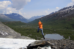 一路峰回路转,中午时分,远远的看见一座巨大的白色冰山出现在路的尽头。看看地图,原来我们已经到了著名的Worthington Glacier。这是一个远看形似五角星型的巨大冰川,几乎覆盖了整座山体,怪不得看上去象是座冰山。公路几乎就贴着冰川的脚下而过,因此路边的几个Turnout是观赏冰川的最佳地点。我们下车的时候,前面的一辆吉普车前两个帅哥正在张牙舞爪的跳个不停,动作很是怪异。仔细一看,一个家伙手里居然拿着个的遥控器,两人跳跃的同时还在自拍,结果折腾了半天一张都没拍上,让旁边的几个MM着实耻笑一番。