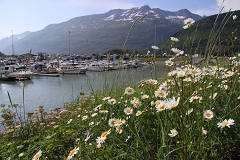 地处Prince William Sound东北角的Valdez是个雪山环拥的港口小镇,有”北美的瑞士”之美称。绿茵簇拥,冰川盖顶的座座高山半拥着风平浪静的海湾,而山水之间座落这整洁质朴的小小城镇。为了方便明天一早上船,我们扎营在离轮渡码头咫尺之遥的Bear Paw Campground。把家安顿好后我们就开始在小城闲逛,按着Lonely Planet上推荐的景点一一寻来。小镇的Small-boat Harbor是个散步的好地方,岸边野花簇簇,水中桅帆林立,沿着水边整洁的木栈道走走看看,想像一下生活在这里的闲散自在。随后去Valdez的旧城遗址凭吊一番,这座风景优美的小城实在是命运多舛。先是被1964年的大地震夷为平地,择地重建后的港口又在1989年惨遭油船倾覆的灭顶之灾,直到20年后的今天,那些泄露的原油对生态的影响还没有完全消除。小城的外围有一条滨海公路,我们也没细看就拐了上去,走着走着忽然发现GPS好象中了邪,放着笔直的大路不指示,一会儿信号丢失,一会儿显示我们已经开进了汪洋大海。一路上并无什么特别之处,水边有人钓鱼,甚至还有一片自助式的营地,风景很不错。走到半路才发现前方铁门紧闭,戒备森严,再仔细一看,发现里面原来是输油管道的终端码头。大概这里是军事重地,所有GPS才会失灵。