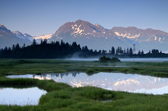早上一起来GuanGuan就神情严肃的说他昨晚起来想去拍夜景,居然发现我们的车右侧的车门大开。当时把他吓坏了,以为所有的装备都被偷走了,打开后备箱一看原来是虚惊一场,两个相机和大嘴盘都在,想来一定是昨天收拾完东西后忘了关车门。可是昨晚临睡前明明用遥控器锁了车,也听到那嘀的一声响了。我们以前开过的车几乎都有个功能,当车门没关好时用遥控器锁车时就不会发出”嘀嘀”的声响,换句话说,如果听到了声音就说明一切正常。我们把车开离营地后反复试了几次,结果发现这辆Dodge不管车门开关与否一律乱叫一气。唉!这美国车的设计真是有问题。看时间还早我们又来到了路边的那片沼泽地,水面上一层飘渺的晨雾为雪山和倒影平添了几许梦幻。GuanGuan不由分说又摆开了拍照的架势,而苦命的我却无暇享受眼前的仙境。趁着GuanGuan照相的空儿,我拎着那两双满是泥污的登山鞋到旁边的小瀑布去冲洗,明天去Seward爬山还全仗着这双鞋呢。借着瀑布湍急清亮的水流,我总算将鞋上沟沟坎坎中的泥沙碎石冲洗干净,两双鞋终于又恢复了本来面目。