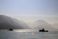7点多我们准时来到码头排队,这趟轮渡从Valdez到Whittier,车与人都要收费,因此价格不菲。渡船分快船和慢船,我们的行程只能赶上慢船,全程近5个小时。虽说耽误一点时间,但因为航线要穿越整个Prince William Sound,因此有机会看到更多的海洋生物和冰川,我对GuanGuan说就全当是坐游轮观景吧。8点钟轮船准时起锚,此时晨光中的Valdez港湾笼罩在一片薄雾之中,朦胧之中层叠的远山,阳光下波光粼粼的大海,如同巨幅的泼墨山水与我们渐行渐远。随船有一位Park Ranger,看样子已经年过花甲却还精神矍铄,一路上给大家讲解着沿途的自然风光,地质结构以及各种海洋动植物,跟着他仿佛上了堂生动的自然科学课。