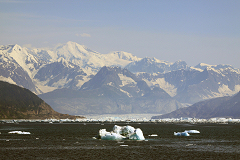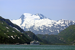 离开Valdez港湾不久,一望无际的海面上逐渐出现了许多大大小小的浮冰。Ranger告诉我们这是从Columbia Glacier上开裂脱落的冰块,那泛着莹莹蓝光的冰块一个个造型优美,在青山碧海之间象一座座流动的雕塑,粉琢玉砌般的精致灵动。山回水转,弯沿的冰河渐渐的从山坳中露出了峥嵘的一角,而后随着船的移动变得越来越清晰。远远看去,滚滚冰河如同巨浪翻腾的洪流被定格在那潮头涌动的瞬间,参差的冰柱,厚重的冰岩,一切虽然只是依稀可见,却足以令你想像那从雪山之巅奔涌而出的冰河应有的壮丽。下次来Valdez,一定要参加这里的Kayak Tour,划着小小的皮艇穿行在千姿百态的冰山之间,那样的感觉一定妙不可言。过了Columbia Glacier,Ranger开始着重介绍起海洋动物。图板上有各种鱼类的示意图,还有一块及其柔软密实的水獭皮供大家传看。甲板上海风凉意袭人,大部分乘客都回到了船舱,只有GuanGuan还执着的在外面游荡。一路上还真让他发现了不少动物,先是几条象海豚一样在船的左右跳来跳去的Dall's Porpoise,随后又是一条只露出背鳍的Salmon Shark,最后连Ranger老头都夸他眼力好,还奖励他一个小钥匙链,乐得GuanGuan象个得了奖状的小学生。在船上转转看看很快就到了中午,午饭后小睡了一会儿。随后感觉船的速度逐渐慢了下来,Whittier港已经遥遥在望了。