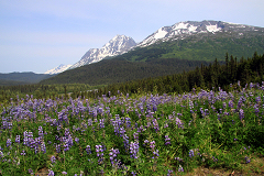 Seward Highway是Alaska又一条观光路,公路两边同样是山高水长的壮美。曾经为落基山脉中冰原大道(Icefield Parkway)的景致所折服,而今在Alaska,感觉任何一条平常的Scenic Byway,其风光之壮丽都毫不逊于冰原大道。我们一路上仍然是走走停停,Kenai Lake的湖光山色,Snow River Valley的山花烂漫都让我们流连忘返,就这样晃悠到Seward已经是下午5点多了。今天是美国的独立日,又赶上周末,我早已预料到城中的旅馆酒店一定是爆满,但是觉得找块空地露营应该不是问题。结果没想到从Waterfront Park到Forest Acres,甚至到城外的私人营地Stoney Creek RV Park,迎接我们的都是客满的大牌子。GuanGuan和我心灰意冷,Lonely Planet上列出的营地只剩下10公里之外的Bear Creek Park了,我们决定再去碰碰运气,实在不行就只能去找野地了。最终我们运气还算不错,总算在Bear Creek有了一方安身之处。