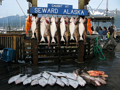 安营扎寨后我们返回Seward去吃晚饭,在Subway填饱肚子之后开始在码头闲逛。Waterfront Park如今已经成了RV的集散地,只见硕大的房车一辆紧挨着一辆的在海边排开,真是我的门对着你的窗,哪里还有一点儿野趣可言。不过露营的人们倒是自得其乐,有的看书,有的钓鱼,有的围着篝火聊天。每年的国庆Seward都有很多活动,如Mt. Marathon Race,以及夜晚的焰火等等,感觉Anchorage中半个城的人都聚集到这个海滨小镇来过节了,真是前所未有的热闹景象。码头上同样是人来人往的喧闹,许多人推着装满鱼的小车忙个不停。走着走着,忽然见前面围了一大群人,走到近前一看,哇!地上堆着好多的鱼,足有20多条。我除了认识当中扁扁的比目鱼,其他红红黑黑体型肥大的鱼都叫不上名字。有个家伙正在把鱼一条条的挂到展示架上,颜色和品种搭配得满和谐的,最后还要把血污冲洗干净,都布置好之后有七八个人欢天喜地的走上前去合影留念。原来这是参加Fishing Tour回来后的成果展示,那种红红火火的场面可以称得上是最好的广告。连GuanGuan和我这等对钓鱼没什么兴趣的人此时都有些跃跃欲试。下次约上那几个渔友一同来吧,相信美丽的Alaska会让每一个人为之着迷。