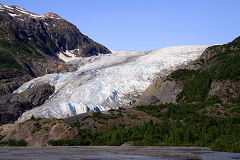 在开始艰苦的攀登之前我们先绕道去看看山脚下的Exit Glacier。顺着迤逦山路来到Glacier Viewpoint,翠绿的山谷中一条巨大的冰舌仿佛从天而降,象一道白色的洪流从山顶奔涌而下。不同于以前所见的冰川四周都是冷峻荒芜的冰碛(Moraine),Exit Glacier两旁真可谓山色葱茏,满面苍翠,比别处更多了几分秀美。再往前就一直来到了冰川之缘(Glacier’s Edge),为安全起见路边有绳索拦挡,游客是无法与那万年坚冰亲密接触的。经历了昨日的冰川历险,如今即使没有绳子GuanGuan和我也不敢贸然上前了。近看冰川,那晶莹的冰块中透出的幽幽蓝光总是那般令人迷恋,那是一种经过万年的岁月沉积才能拥有的静谧。也许冰河运动夹带的砂砾会使它看上去有些污渍,但是这表面上的尘沙终归难掩那其中摄人的美艳。
