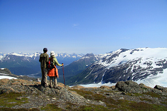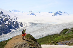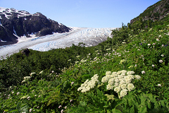 昨夜朦胧之中听见放焰火的巨响,不过实在是困得爬不起来。我们住的地方还供应简单的早餐,用面包牛奶好歹填饱了肚子。随后我们驾车直奔Exit Glacier,拐上Exit Glacier Rd.后路两旁的情形真让我们吓了一跳。只见小河边树丛后影影绰绰的都是帐篷,昨夜居然有这么多人露宿荒郊呀!来到Kenai Fjord National Park的门口,原本以为我们来得够早了,谁知诺大的停车场此时已经几乎满了一半,可见这地方是多么的热门。今天的主要任务是徒步著名的Harding Icefield Trail,小路不算长,单程不过6公里,但是海拔升高却有近千米,因此走下来并不轻松。今天是个少有的大晴天,气温很高。为保险起见我们还是带了外套,又装上5瓶运动饮料,再加上午饭和零食,收拾齐整后开始了今天的徒步之旅。