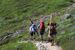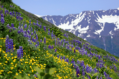 看够了风景和美女帅哥,我们再次上路开始爬山。一路上走得气喘吁吁,好不容易盘盘绕绕的爬到了Top of Cliffs。放眼望去,滚滚的冰河终于静卧在脚下的山谷中,那无边无际的漫漫冰原终于在面前一览无余,那样辽阔壮美的冰雪世界带来的震撼真的无法用语言描述。与之相比,奔涌的冰川如同小河,巍峨的山峰则化身汪洋之中的孤岛。那是一种与Denali的苍凉完全不同的壮丽,却诠释着同样的天地之大,自然之美。还没有看够左边的冰雪奇观,我又被右手边一大片山花烂漫所倾倒。一株株紫色的Wild Lupins亭亭玉立,一簇簇黄色的Glacier Poppy摇曳生姿,那冷艳的紫与明艳的黄交织在绿油油的山坡上,就象是一幅巨大的花毯满山铺开,看得人眼花缭乱,想来传说中的事外仙源也不过惊艳如此吧。