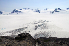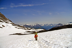 随着海拔的升高,辽阔的冰原终于在冰川之上显露出来。我们很快就来到了Bottom of Cliffs,前方陡峭的山坡上是迂回无尽的之字型山路,看上去真有些恐怖。大部分人都要在这里休整一下,为后半程更加艰辛的攀登作好准备。看看身边过往的人们,忽然发现其中有许多有趣的三人组合。有年轻夫妇陪着老父亲,有行动缓慢却风趣幽默的三位阿姨,有三个装束性感的美少女,还有三个光头DD,背包上插着一面不知是什么组织的会旗,扛着至少两个相机三个镜头(包括大白和小白)一路轻松的超过了我们。这等牛人已经让我和GuanGuan佩服得五体投地了,没想到不多时从山上走下来三个武装到牙齿的GG,每人背着硕大的登山包和一副一人多长的滑雪板,穿着雪靴,拄着雪杖一路健步如飞。GuanGuan和我简直都看傻了,在Alaska真是牛人遍地走,没有最牛,只有更牛。