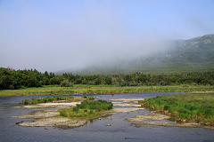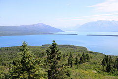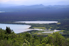 出了营地的铁栅栏门我们就置身密林之中了,这条路真的是鲜有涉足,小路两边的荒草足有半人多高,再加上四周茂密的树林遮天蔽日,我感觉就象被投入了侏罗纪公园中那个遍地恐龙的荒岛,身边处处危机四伏,心里别提有多紧张了。任何一点风吹草动都会被我们当成是熊的迹象。为了警告附近的熊熊,更准确的说是为了给自己壮胆,GuanGuan和我开始交替着大喊大叫,外带拍手跺脚。我预计这个样子1.5mile走下来我们嗓子没喊哑手也得拍肿了。就这么提心吊胆,瞻前顾后的走了一段,刚刚对周围的环境有点适应时猛然发现前方有黑影一闪,还没等我惊讶得叫出声来,那个黑影已经欢喜的向我们打招呼了。没想到我们居然遇到了一位志同道合的同伴,相比之下,这家伙竟敢孤身一人独闯深山,更是勇敢的令人佩服。攀谈之中得知他和同伴来自挪威,其他人都只热衷看熊,而他还是个观鸟爱好者,今天特意来爬山看鸟。三人结伴同行立刻感觉安全了许多,身边的树林也不再象先前那样阴森恐怖了。没过多久我们终于走出了树林,连绵的苍翠群山终于在灌木丛后延展出来,午后的艳阳照得身上暖洋洋的,一路上所有的紧张恐惧都在阳光下烟消云散了。Katmai真是个神奇而美丽的地方,独有的火山地貌,近距离的观看棕熊,还有这无处不在的山青水秀。从半山腰俯瞰,绿树丛中的Brooks River, 河面上窄窄的浮桥都尽收眼底,而最迷人的还是碧波千倾的Naknek Lake,那天空一般明净澄澈的蓝衬得远处的雪山更加圣洁,眼前的青山更加秀丽。山山水水就是有这样永恒的魅力,无需高山仰止,无需瑶池圣湖,只需如此简简单单的一带青山,一泓碧水就足以绘出最美的图画。