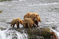 早上终于可以睡到自然醒了。今天不用赶时间,也没有任何预订的项目,我们要在Katmai尽情享受与熊共舞的乐趣。清晨的Naknek Lake薄雾轻笼,远处的湖边有两头熊趴在岸边酣睡,没有飞机的轰鸣,汽车的喧闹,回荡在耳畔的只有轻波拍岸,鸟鸣山林。如此的简单平凡,却令人有置身世外桃源般的迷醉。在营地悠闲的吃完早饭后我们便前往瀑布,早晨的天气有些阴沉,虽然光线不是很好,但平台上已经站了不少人。GuanGuan好不容易跻身前排,在一排林立的三脚架丛中占了一席之地。而我只能栖身后排众人之后,最后还是一位老先生侧身让出一块地方,我才终于能够倚栏而观。