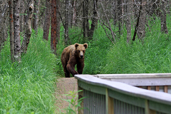 回到营地后已经是中午时分,做午饭的时候我们开始讨论下午的计划。原本打算去爬Dumpling Mountain,但是深入这老熊出没的深山密林实在是需要点勇气。我们特意去咨询了Ranger,据他们讲现在是三文鱼洄游的旺季,大部分的熊都在湖边或者河里活动,在山上遇到熊的机会不大。听完之后我们多多少少还添了点信心,只不过如今几乎所有的游客都在山下看熊,去爬山的人太少了。俗话说人多势众,如今只有我们两个人,这万一要是真和老熊打个照面还真不好应付。就这样GuanGuan和我前思后想,犹豫再三,最后还是在这个阳光明媚的午后壮起鼠胆,毅然踏上了登山小路。