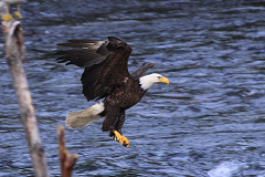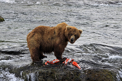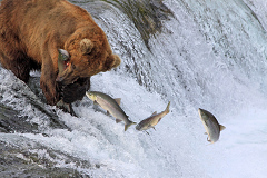 今天的Brooks Falls真是热闹非常,整个晚上鱼跃熊欢,精彩纷呈,连白头鹰都来凑热闹。近乎疯狂的三文鱼在清澈的河水中成群结队,浩浩荡荡的逆流而上,在瀑布下面集结成黑压压的一片。棕熊们在水里忙得不亦乐乎,有三只熊在瀑布的顶端轮番上阵,那两个绝佳的捕鱼位置就几乎没有闲置过。几乎每一分钟都有熊能成功的抓到鱼,同时也有鱼成功的避开熊口,逃之夭夭。很多时候经常有两三条鱼同时跃出水面,让那几只身手敏捷的熊都有些措手不及似的。与此同时比河里的熊更兴奋的是站在平台上的人们。经过三天的实践,GuanGuan已经能够十分娴熟的驾驭他的相机去捕捉那鱼入熊口的经典一瞬了。台子上的人们,无论是职业的摄影师还是象GuanGuan一样的发烧友,此时必备的设备就是三脚架,相机加长焦镜头和快门线。将相机设置成高速连拍,镜头调整好对准那只站在瀑布顶端的熊,随后所做的就是手握快门线,目不转睛的盯着水面在那里守株待兔。一旦发现有鱼跃出水面就毫不犹豫的按下快门。用每秒三张以上的速度连拍五六张,这样才有可能抓拍到那精彩的瞬间。所以每当有鱼跳起时,耳边的快门声就会象爆米花似的的响成一片。前两天每拍完一轮大家还有机会在相机上回放一下照片,相互参考点评一下,而今天晚上好象根本没有时间看看前面的片子,一群群的鱼就那样前仆后继的向上游发起冲击,你方唱罢我又登场,不光让水中的棕熊应接不暇,也让岸上的人们手忙脚乱。在Katmai的几天中,我们也深深体会到做一名职业摄影师的不易。在Brooks Falls拍照需要的不是高难的技巧而是耐心和运气。那拍照的过程看似简单,但是想要再现那经典之完美却并非易事。熊的姿 态,鱼的位置都要恰到好处,周围还不能有任何因素干扰。因此在成百上千张照片中能出一两张作品就已经相当不错了。此外,Katmai之行开销昂贵,机票住宿再加上一日三餐,每个人都希望在花了这么多钱后能有所斩获。种种原因使得这些职业摄影人看上去那么与众不同,不单单是他们身边顶级的摄影器材,还在于他们自始至终的不苟言笑。尤其是每当出现一些比较搞笑的场景时,比如到嘴的鱼又丢了,或者什么小熊偷食之类,大部分人都会兴高采烈的谈论一番,感叹一番,只有他们不为所动,而是执着而专注的倾心于他们所要的作品。