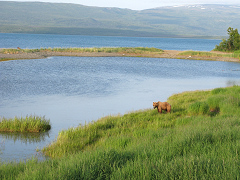 直到夜幕降临,河面上渐渐昏暗下来我们才终于离开平台。在夜色中穿过那片幽暗的密林还真需要点勇气。GuanGuan和我恨不能眼观八路,耳听十方,生怕半途跳出只过路的熊熊。来到河边的平台上环顾四周,暮色中的Katmai别有一番动人的美。幽蓝的湖水衬着远山如黛,湖边的青草和芦苇在微风轻拂下荡漾着层层波浪,一头棕熊孤独的游走在麦浪一般起伏的草丛中。山和水,人与野兽此时都是大自然的产物,彼此可以这样和谐共存。这是我们在Katmai的最后一个晚上了,想想就要离开这里,离开Alaska,心情不禁有些黯然。我们在湖畔徜徉了很久才恋恋不舍的回了营地。