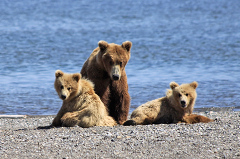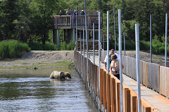 时近中午我们要回到Lodge吃午饭。因为所有的炊具已打包运走,我们决定午餐去尝尝那价格不菲的自助餐。来到下游时浮桥如意料之中又关闭了,不过在等待的过程中我们居然又看了一出精彩好戏。一只母熊带着它的两头幼仔正在河里抓鱼,只见熊妈妈左冲右突的在河水之中一通的扑腾,而那两只小熊在一旁有样学样,模仿着妈妈的姿势在在水中跑来跑去的。Ranger说这是典型的母亲在给它的孩子们传授捕鱼的技巧。小熊跟着母亲的两年中,熊妈妈不但要为它们觅食,更重要的是要教会它们独自生活的本领。相比熊妈妈的奉献精神,只管播种不管养育的熊爸爸就太不负责任了。耐心等待了半个小时后终于有了个空档,Ranger让我们几个抓紧时间快速过桥。十来个人中我们还算行动敏捷,另一位大叔因为身材肥胖动作要迟缓许多,等他上了桥刚走了没几步,有一只熊本来已经从桥下游过去了,大概是听见了身后的动静,居然又转回头向浮桥走来。一时间两边岸上的人们都紧张无比,Ranger大喊着让胖叔加快速度,游客们也又拍手又尖叫的想让熊近看离开。再看桥上的胖叔倒是挺沉着的,只顾得上埋头赶路,不敢对栏杆外的熊多看一眼。