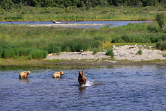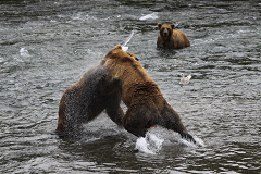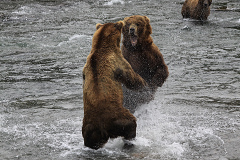 安顿好行李,又确认了一下晚上的飞机。一切安排妥当后我们再次来到Brooks Falls。今天瀑布边的情形与昨晚简直是判若两地。一个小时之中好不夸张的说只有不超过5条鱼从水中跃起,相比昨晚的疯狂情景,眼前的一切真是太出人意料了。而更令人意想不到的是今天我们竟然见识了到Katmai以来最激烈的一场棕熊大战。前几天也不时的有因为争鱼而发生的打斗,不过场面都不大,顶多是两只熊冲对方大吼几声,然后就以一方主动退出认输而告终。而今天发生的一切既精彩又颇具戏剧性。大概是因为今天鱼群太不活跃,挨饿的熊比较多,所以就有不少家伙开始寻衅滋事。只见有一头很健壮的成年公熊从水里摸了条鱼上来,正准备到旁边找个地方饱餐一顿。此时另一头体格相当的公熊大大咧咧的走了过来,看那架势就准备明抢了,鱼的主人当然是毫不示弱,把早餐放到一边就迎了上去。两头熊同样先是礼节性的冲对方大吼两声,发现对手没有被吓走后两只熊同时往后退了一步,伏下身,拉开了架势后猛然跳起来扑向对方,随即就扭打在一起了。那一系列的动作真是和摔跤运动员无异。一时间水花四溅,吼声连连。两只熊都站起来用前爪攻击对方,一边打斗一边面目狰狞的大吼大叫,那场面真称得上惊心动魄。交手几个回合之后两个家伙又都退一步下来喘口气,而后再拉开架势飞扑上去接着打。平台上 的人们都看呆了,谁成想就在两只熊打得难解难分的时候,一只躲在一旁一直在看热闹的半大小熊竟然偷偷摸摸的溜过来,瞅着机会一下子就把那条放在一边的鱼叼走了。而那两个掐得正欢的家伙发现鱼没了之后立即偃旗息鼓,两人就当什么都没有发生过一样各自离开了。一个回到瀑布边上继续抓鱼,另一个回到岸边继续寻找可乘之机,而那只捡了便宜的小熊和它的哥们儿们一起在下游正大快朵颐呢。在Katmai的日日夜夜,生活永远不会单调乏味,你从中可以发现那么多的惊喜,那么多的精彩。