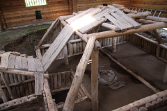 参加下午活动的人居然有近30人。我们的领导是个年轻mm,在大学中的专业竟然是考古学。在我们的印象中,Katmai是一片纯粹的荒野,是无人涉足的野生动物的天堂。其实不然,早在3000多年以前就有人类在此居住生活。在Brooks River沿岸发现了许多的房屋遗迹,1967年在其中的一处遗址上仿建了一座当时人们居住的房屋框架,其实跟地窖差不多。那时的人们以渔猎为生,同时也种植一些简单的农作物。Ranger带着我们一路边走边看边讲,一个多小时很快就过去了。结束了Culture Walk,看时间还早,GuanGuan和我决定再最后去看一眼Brooks Falls。此时是平台上人最多的时候,等了半个多小时才终于轮到我们。瀑布上下一如早晨那样的平静,周围有许多熟悉的面孔,大家每天都在旅馆和平台上碰面数次,还有许多的新面孔,很多人都来自遥远的欧洲。我们都没有再忙着拍照,Katmai的魅力已无需相片去验证。