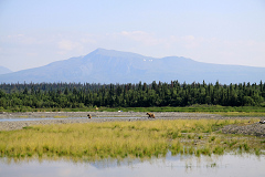 我们在Katmai的最后一天在这个忙忙碌碌的早晨开始了。公园规定所有今天离开的游客要在九点之前把大件的拖运行李放到Lodge门口,所以虽然我们的飞机是晚7点起飞,我们仍然得一早就打点行囊。吃完早饭,洗漱完毕,我留在营地整理东西,GuanGuan到公园办公室去找手推车。可是等我把东西都收拾好了GuanGuan也没回来,眼看就快到9点了,真是急得我望眼欲穿。好不容易等到他拖着辆空车一路颠簸着回来了。原来他刚出营地就看见Ranger在封路,因为有两头熊正在沙滩上睡觉,从营地到Park Office的必经之路不让走了,游人都得钻树林抄小路。这去的时候还能穿林子,可是等GuanGuan拉车回来的时候Ranger已经离开了,他拖着个车又没法进树林,最后只能硬着头皮从熊的眼前溜过。大概是离拿两头熊太近了,这两趟路走下来,连一向沉着大胆的GuanGuan到了我面前竟然还是一副惊魂未定的样子。如今我们也别无选择,装好行李后还得去打扰拿两只懒熊。一路上我只能祈祷拿两个家伙是吃饱了犯困,只要它们吃饱了肚子就不会多我俩感兴趣了。在拐上右边的岔路之前,趴在沙滩上的棕熊已经看得很清楚了,大概是听见了车子”哐当,哐当”颠簸的声音,其中一只熊竟然抬头循声向着我们这边张望。那一刻我只觉得心骤然提到了嗓子眼儿,也顾不得多想,只能把头一低,推着车跟着GuanGuan一溜烟的跑了过去。好在是有惊无险,总算在9点之前把行李送到了指定地点。