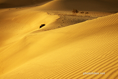 早上还在昏睡的时候闹钟就响了。今天要去沙丘拍日出,而我们还得先开几十公里才能到地方,所以天刚蒙蒙亮就得爬起来。开车出了营地沿Hwy 190一路向西,越往前走云层越厚,而不知不觉中身后已是红霞满溢。GuanGuan和我停下车感叹了一番朝霞的艳丽,随后继续赶往Mesquite Flat Sand Dunes。Death Valley地形复杂,地貌独特,不但有象Racetrack和Badwater这样独一无二的景观,就连Sand Dunes,Badland这样的”普通”景象在这里也被演绎出不同的韵味。我们来到沙丘的时候停车场上已经有四五辆车了,可以远远看见沙山上人如蚁行。晨光中的沙丘是摄影爱好者的乐园,要想在这里起早贪黑的追逐光影最好是住在附近的Stovepipe Wells,省去每天的奔波之苦。