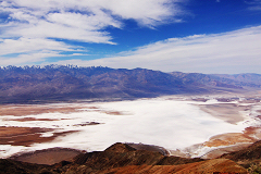 出了峡谷,在Zabriskie Point短暂停留后我们直奔著名的Dantes View。沿着盘山公路一路攀升,我们很快从低于海平面的谷底来到了海拔近1700米的山巅。顺着山顶的小路爬上更高的山头,环视四周群山巍峨,Panamint Range中的雪峰仿佛触手可及。而眼前最壮观的不是高耸的雪山,而是山脚下宽阔山谷中的那片白花花,明晃晃的盐滩,Badwater Basin。以往的登高远眺,看的多是山峦叠翠,旷野无边,而今目之所及满是赭红色山体的粗犷。Badwater Basin洁白如雪,如同一大幅铺陈开来的生宣,大自然执河流为笔,蘸山石泥土为墨,在上面恣意挥洒出一幅彩绘。优美的线条,浓淡相宜的色彩,虽然少了些绿色的生机,却展现着一份岁月沉淀下的凝重。我们下了右边的山头又爬上左边的山崖,看山,看水,由远及近,无穷无尽。
