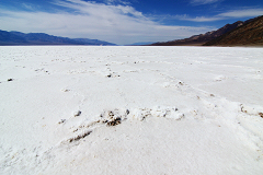 中午时分我们来到Death Valley中另一个颇负盛名的景点,Badwater Basin。这里之所以声名显赫首先是因为它的海拔-86米,是整个北美洲的最低点。其次便是那与众不同的奇特地貌。眼前这片银白色的盐滩在午后的艳阳下光芒耀眼,如同白雪皑皑的苍茫大地。靠近公路边有个小池塘,原本清冽的泉水在四周广阔的盐碱滩涂的侵蚀下已变得不可饮用,成了名符其实的Badwater。我们离开公路走向Badwater Basin深处,去寻找那些十分上镜的Salt Pan。这片咸水盆地不断的被雨雪之水覆盖,水蒸发后再灌满再蒸发,如此反反复复,从水中析出的盐的结晶便形成了这一圈圈的Salt Pan。其形状有如不规则的六边形,纹理细腻,洁白如雪。只可惜这一片景区游人众多,地上的盐圈圈大部分都被踩平了。虽然拍不出那么经典的照片,GuanGuan和我还是在这片白花花的盐滩上徜徉了很久。