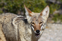 离开Badwater Basin我们继续南下前往Ashford Mill遗址。公路在山谷中顺着山势蜿蜒前行,左侧的山坡上星星点点的绽放着柔柔弱弱的小黄花,若是赶上雨 水和气温都适宜的好年景,那应是漫山遍野的黄花摇曳,锦缎一般的如华如艳。虽然野花稀疏,我们一路上仍然是走走停停,在这片贫瘠的荒山恶水之中,那一簇簇娇艳的黄花是那样的惹人怜爱。在风中摇曳的细细花茎,薄薄的花瓣和淡淡的色彩,虽羸弱却依然在阳光下绽放着灿烂的笑颜,虽孤独却依旧为荒山野谷平添了春日的生机。有趣的是途中我们遇到了一只在路边乞讨的Coyote。我们停下车,它就可怜兮兮的蹲在车门外目不转睛的看着我,GuanGuan让我打开车窗去拍照,我看着它那阴森森的眼神还真有点害怕。不过后来发现它很是老实才放下心来。更有意思的是当我们从Ashford Mill返回的时候,我竟然一眼瞥见它正趴在路边的灌木丛下乘凉呢,等我指挥GuanGuan停下车后,就从后视镜中看见它起身冲着我们颠颠跑来,然后又是静静的守在门边和我”深情对望”。那可怜巴巴的神态真令人恻隐之心萌动呀。可是它毕竟是一只野生动物,一旦喂了它就等于害了它。尤其是象这只这样的动物妈妈,如果它能够轻易的从人类处获取食物,它就不再传授应有的捕食技能给它的幼仔,而是会带着它们一起来乞讨,那样可就后患无穷了。最终我们给它拍了一堆照片,然后和它挥手作别。但愿它们一家能在这片原本就属于它们的土地上自由的生活下去。