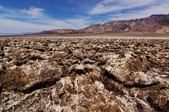 从Dantes View下来后我们直接拐进Badwater Road,准备把沿途的各个景点逐一寻来。上路没多远就到了Golden Canyon,从这里有山路可以一直走到Zabriskie Point,一路上火红的山岩相伴左右,想来是一条非常有特色的线路。可惜如今的我精神短少,体力不支,再加上餐巾纸不离手的擦着鼻子,无奈只得放弃了这原本计划中的行程。随后来到Devil’s Golf Court,不知道是谁这么有才,能把这片荒芜而险恶的土地与高尔夫球场联系在一起。只见一座座由盐砾和砂石堆就的宝塔状的小山包布满了这片雪山脚下的不毛之地,凹凸不平,满目狰狞。曾几何时,这里还是波光粼粼的Lake Manly,而后随着湖水的蒸发,只剩下了这些盐砾和尘沙的混合物,随着岁月的流逝,风霜雨雪最终降它们雕琢成现在的模样。有些结晶出的盐砾从泥土中剥离出来,在阳光下不但晶莹剔透,而且造型奇特,公园中有专门的”Ranger Lead Tour”带游人去寻找这些美丽的东西。