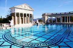 越往上走山路越陡,两旁的树木倒是愈加葱茏,很有些浓荫蔽日的幽深感觉。进了大门下车之后,大家被召集到一起讲明参观的注意事项。整个Tour真可谓限制多多,除了照相不能用三脚架,室内不能开闪光灯之外,还要严格跟随导游,不得超前,不得落后。我们的参观从室外开始,造型典雅的喷泉,昂贵的白色大理石雕像,色彩斑斓的甬道和台阶,看得人眼花缭乱。尤其是那个如同希腊宫殿一般奢华的室外游泳池Naptune Pool,雪白的游廊和雕塑配上那一池碧蓝的清澈池水和池底精美的瓷砖铺成的图案,让人感觉实在是豪华到了极致。但是等走到室内时才发现,刚才在室外所见不过是小儿科,真正的奢华是那无处不在的从欧洲不远千里运来的名画,古董,古典家具,吊灯,地毯甚者是地板。不论是客厅,餐厅还是游戏厅中都布满了这些显示主人财富和品味的收藏,使得一个个原本高大敞亮的大厅显得昏暗而又狭窄,令人感觉颇为压抑。室内的参观以Roman Pool作为结尾,这个四壁满布精美马赛克的室内游泳池更是灯光幽暗,色调阴郁。我总觉得在这房子里住久了会得抑郁症呀!近一个小时的参观下来,这座著名的私人庄园最令我垂涎的是那拥有无敌山海风光的露台,还有那房前屋后果实累累的各种果树。硕大的金桔和橙子挂满枝头,黄澄澄的果,红灿灿的花,看在眼中才是心旷神怡的感觉。