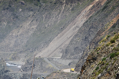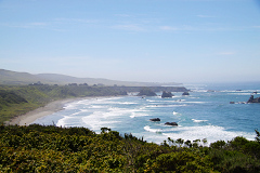 离开Hearst Castle我们继续北上,目标只有一个,那就是尽可能多的看看Highway 1两边的风景。公路沿着海滩走了一段之后在不经意间骤然陡峭起来,窄窄的公路在半山腰上沿着曲折的海岸线迤逦前行,宽广而又壮丽的山海秀色在眼前一览无余。碧波万顷的大海,连绵高耸的群山,如雪的浪潮一波又一波的拍击着岸边的陡峭山崖和礁石。欣赏美景之余,我们也不得不感叹山路的惊险,一边是高山绝壁,一边是百丈悬崖,游走在这狭窄而又弯弯曲曲的公路上,天海一色,山海相接,风光无限。可惜如此壮观的景色没能持续多久,一道路障再一次拦住了去路。下车后我们又往前走了一段,看见有几辆重型卡车来来往往的正在运送砂石,而卡车行进的终点正是山体滑坡的现场。大面积的土石从山坡上坍塌滑落,很长的一段公路已经彻底被掩埋甚者冲垮了,看得人触目惊心。身边那庞然大物般的卡车到了那片塌方下立刻小得象蚂蚁,真不知道这么大规模的滑坡要清理到哪一天。对着前方几十公里之外的Big Sur投去深情而又无奈的一瞥之后,我们调转车头原路返回。