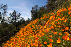 当柏油路终于走到尽头的时候,成片的加州罂粟开满了两边陡峭的山坡。单薄却鲜艳无比的花瓣摇曳在午后的艳阳下,如翻飞起舞的蝴蝶般轻盈。山坡很陡,想向昨天那样徜徉在花丛中并非易事,视野也不如保护区那样开阔。但是山坡上的野花也有着特有的美丽,自上而下或浓或淡的色彩,层次分明,再加上远山近树的相互映衬,也着实美不胜收。今年的寻花之旅,有遗憾也不乏惊喜,虽然一路上屡次以失望开始,但如今终于在山巅的花丛中划上了圆满的句号。