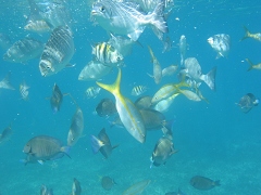 我们在离岸大约一公里的海面上抛锚,随后我们的向导向水里扔了几块面包,眼看着一片水花翻腾,鱼群蜂拥而上,各式各样五颜六色的小鱼看得人眼花缭乱。GuanGuan和我赶紧跳下水,蓝莹莹的海水清澈透亮,我还是头一次这样近距离的与鱼共舞,那些色彩鲜艳的热带鱼就在身边游来荡去,好像伸手就能捉到一条。可是真等我伸出手,小鱼早就一个急转弯跑没了影。我也知道自己的想法很幼稚,但那些小鱼太可爱了,实在忍不住想摸一摸。把鱼儿喂得差不多了,我才发现海底的珊瑚礁也挺好看的,可是几次试图潜得更深一点都没成功,反而累得精疲力尽。又在海上漂了一会儿后终于力不从心的爬回船上。GuanGuan还在水中游得正欢,摆弄着他的自制水下相机拍个不停。向导索性带着他去了更远些的地方。来古巴之前一直为水下相机发愁,本来想买个一次性的,看网上说效果太差,而专业的防水壳又太贵,最后在我都想放弃的时候GuanGuan自告奋勇的要自制防水套。他搜罗了一堆塑料布和有机玻璃,随后又是熨斗又是螺丝的一通忙活,最终还是在我的协助下给G2做了一个不错的防水外套,还是可拆装的。拍出的照片还说得过去,GuanGuan对此颇为得意。