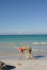 在海边除了浮潜,游泳和晒太阳,GuanGuan和我还有另一项消遣,拍点儿自娱自乐照。La Salina占地面积大,海岸线也很长,而且酒店的左边是个保护区,因此那一带的沙滩人迹罕至,正好让我们尽情发挥一番。穿上我最钟爱的长裙,执一条飘逸的纱巾,伫立水边的我衣袂翩然,亭亭玉立着实自我欣赏了一番。爱美是女人的天性,但是对于我来说,我喜爱长裙的飘逸与端庄,其他的诸如超短裙,铅笔裤和吊带装这些时尚元素从不属于我的世界。守旧也好,固执也罢,反正心里就是无法接受那些时髦的衣着。如今在加勒比明朗热烈的气氛中,我好像一下子将所有的顾忌都抛到了九霄云外。镜头中的我,时而热情奔放,时而袅娜妩媚,连GuanGuan都说简直认不出是我了。开始时还是我一个人搔首弄姿,后来GuanGuan也加入进来,我们一起在海边蹦呀跳呀,再摆几个搞笑的造型,虽然到最后累得疲惫不堪,但终于拍到了几张效果极佳的飞跃照。每次看到那些照片我俩都会爆笑不止,实在是太有意思了。