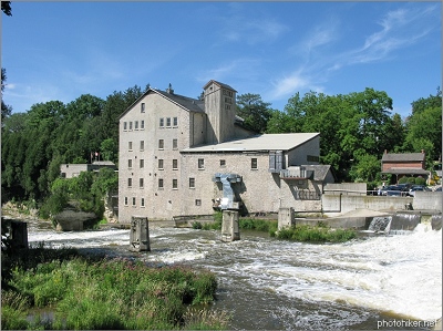 Summary: The original mill at the head of the Elora Gorge was constructed in 1833 and portions of the present structure date back to 1842. The Drimmie Mill as it became known, was made famous in the 1930s by a painting by noted Canadian Group of Seven artist A.J. Casson. The mill operated until 1974 and the five storey stone facade makes it the highest "stone rubble" wall west of Montreal.
