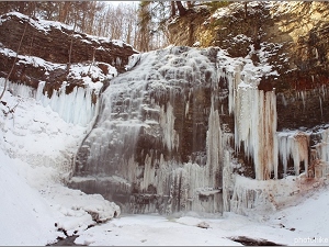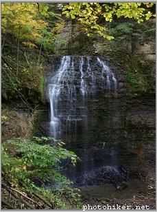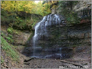 Named after Dr. Oliver Tiffany, the district's first doctor. The waterfall is surrounded by typical Bruce Trail terrain: rocks to step over and steep descents. Tiffany Creek tumbles 21 metres from a broad valley above the escarpment into a V-shaped ravine below. It is an imposing sight, towering above visitors and surrounded by dolostone cliffs on either side.