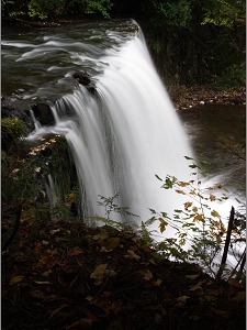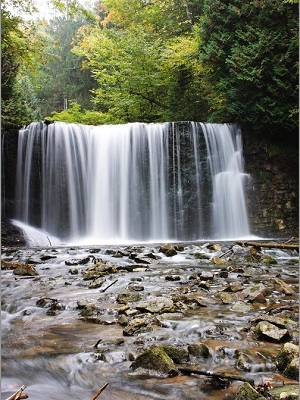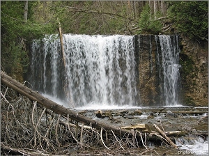 Hoggs Falls are tucked away a mere two-minute walk from the Lower Valley Road near Flesherton. Named for William Hogg, the Boyne River's 7 metres cascade is a sheer and shimmering curtain of water over the rock face in the steep-sided and narrow upper Beaver Valley. the site is protected as a forest reserve managed by the Ontario Ministry of Natural Resources. The clear waters of the river abound with speckled trout and other species and fishing is permitted, in season.