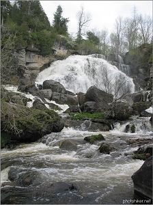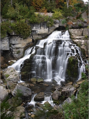 Located in the Inglis Falls Conservation Area, Inglis Falls like many falls in one, the Sydenham River cascades over limestone shelves of an 18-metre cliff that is part of the Niagara Escarpment in the southeastern part of Owen Sound. Viewed from any angle, Inglis Falls gives a panorama of rock, water and ruralscapes that are truly spectacular in any season. Remnants of a nineteenth-century gristmill are reminders of the power in this falling water, as used by Peter Inglis.